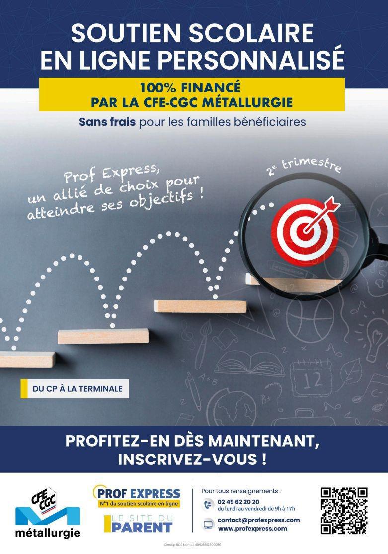 Par défaut, chaque adhérent de la Métallurgie CFE-CGC bénéficie du forfait Argent. Si vous êtes adhérent de la Métallurgie CFE-CGC et que vous bénéficiez au travers de votre entreprise ou de votre comité d'entreprise du service Prof Express via un forfait découverte, bronze ou argent, vous bénéficierez automatiquement du forfait Or. Lorsque vous aurez finalisé votre inscription au service, un opérateur Prof Express vous contactera pour vous faire part des modalités du service et déterminer la nature du forfait dont vous pouvez bénéficier.