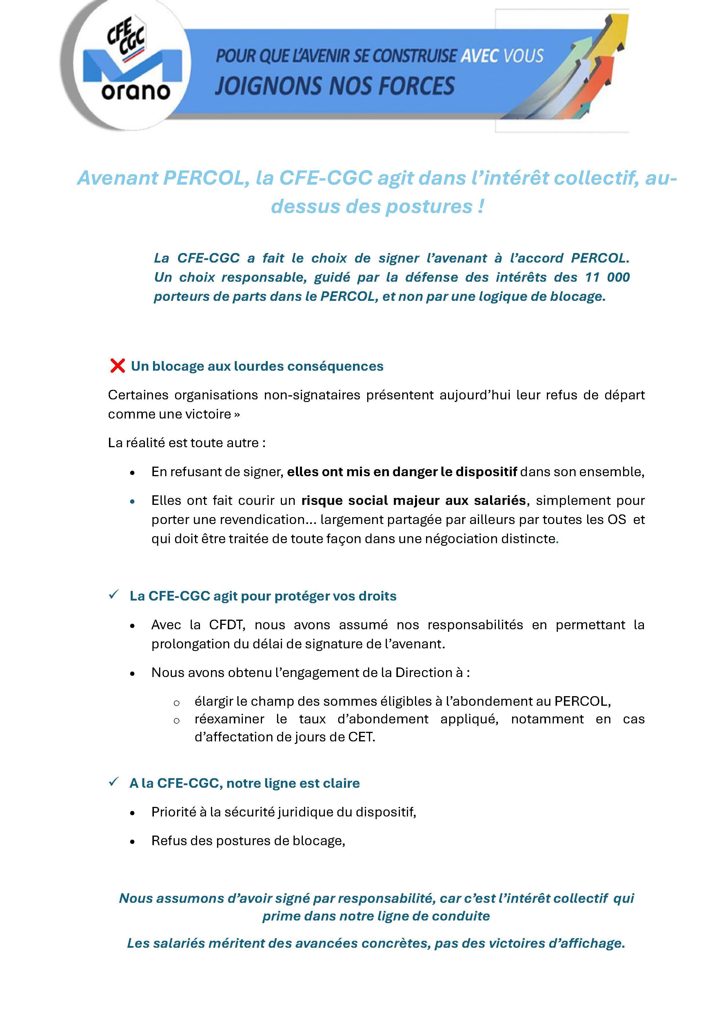 Orano : Avenant PERCOL, la CFE-CGC agit dans l’intérêt collectif, au-dessus des postures !