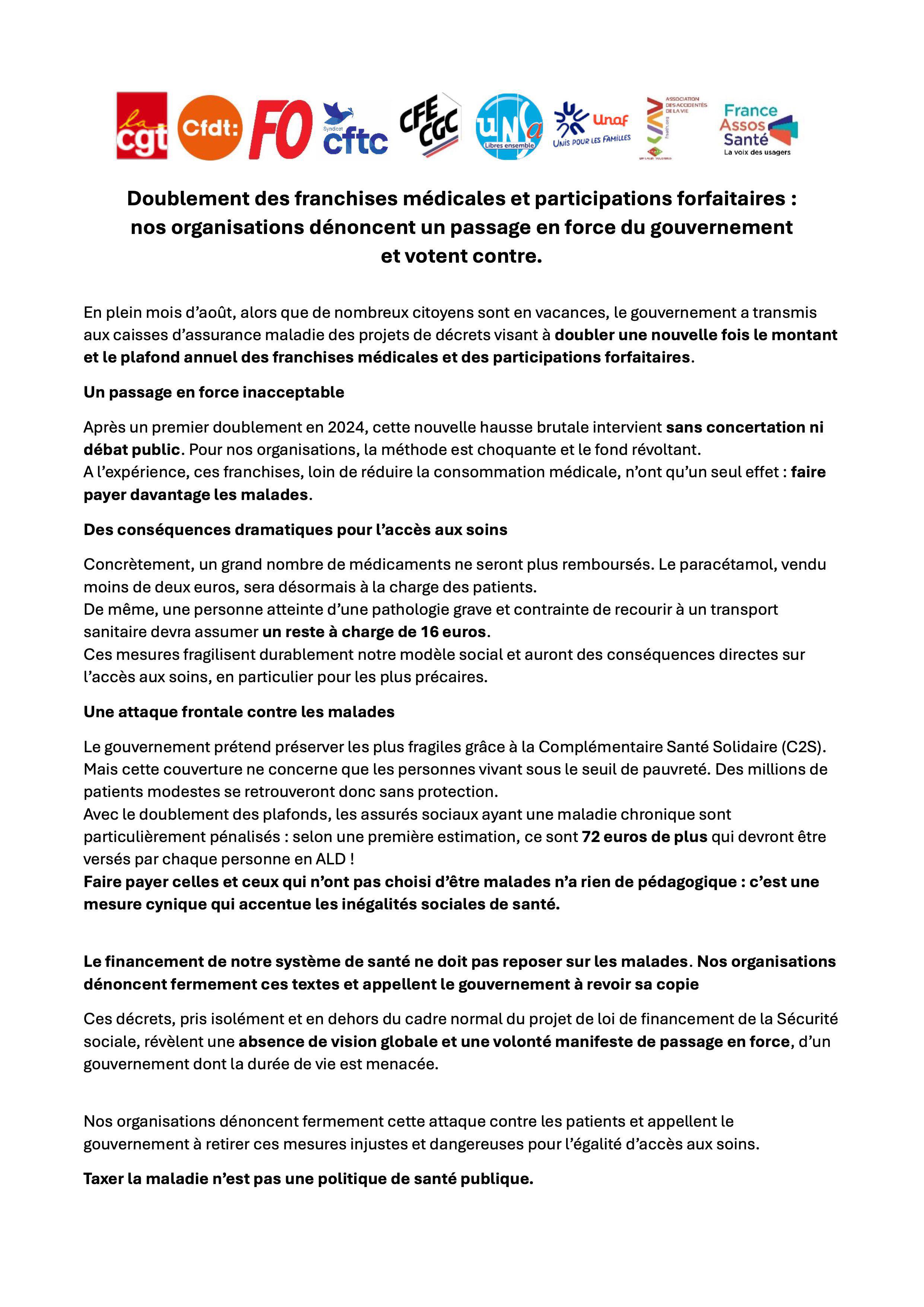 CFE-CGC - Doublement des franchises médicales et participations forfaitaires : nos organisations dénoncent un passage en force du gouvernement et votent contre.